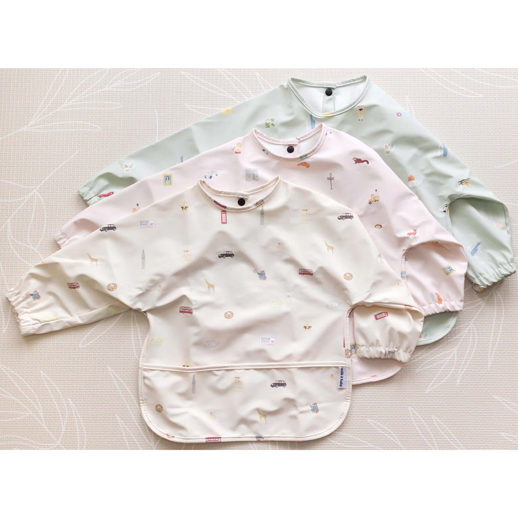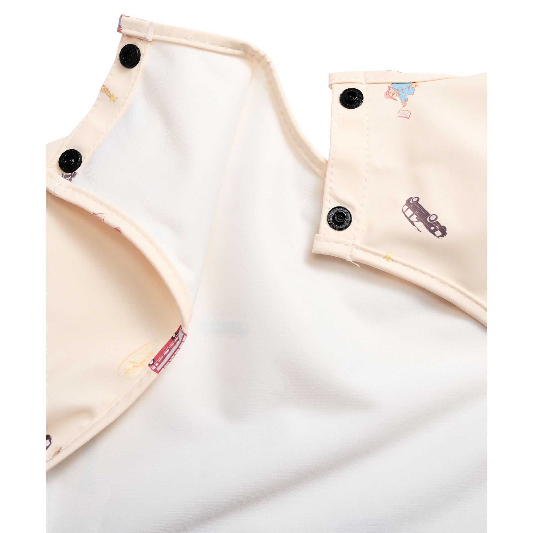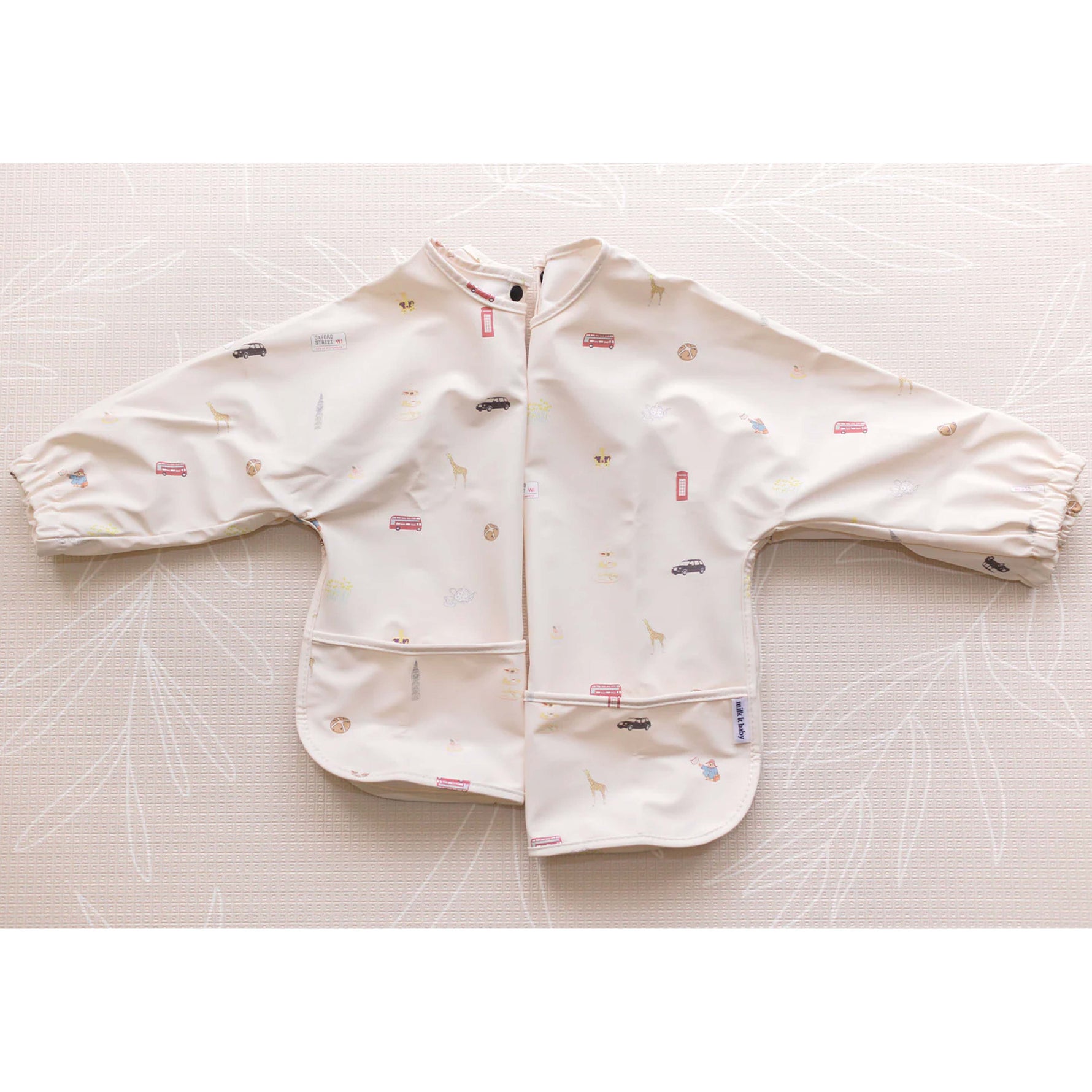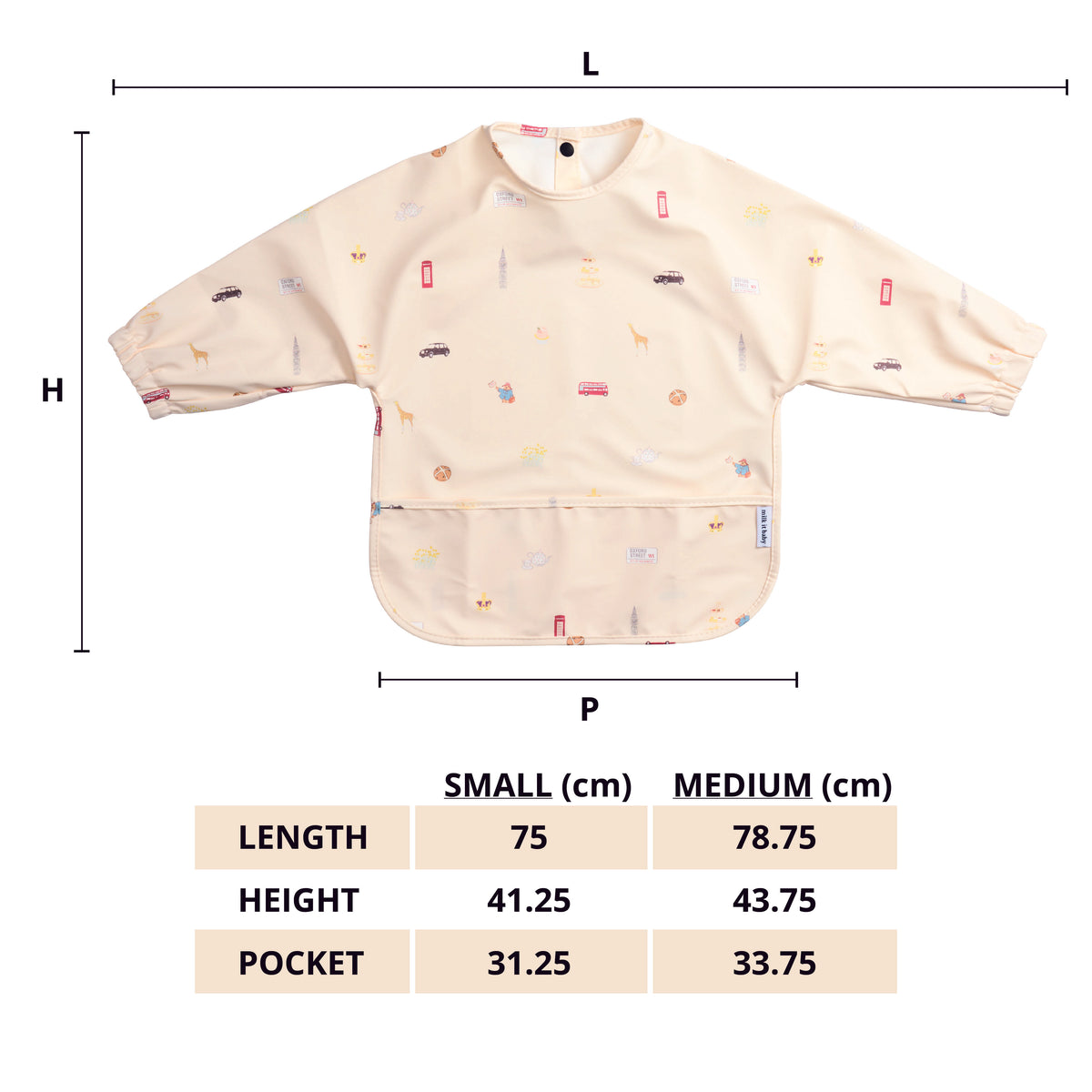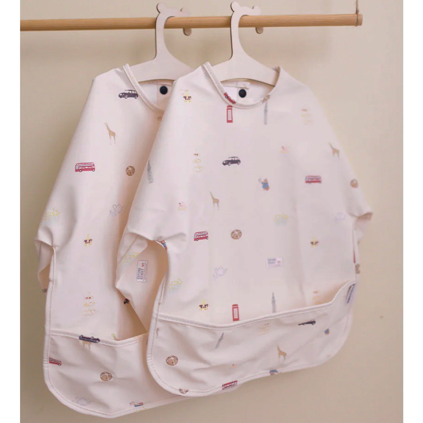 Cheerio, mess! Our London City Printed Bib Sleeve is a playful nod to the charming streets of the UK’s capital. Featuring classic British icons like red double-decker buses, black taxis, Big Ben, crowns, and even Paddington Bear enjoying teatime, this bib brings a whole lot of character to mealtimes. With full-coverage sleeves and a handy catch-all pocket, it's a royally practical way to keep your little one tidy while they explore the taste of adventure.