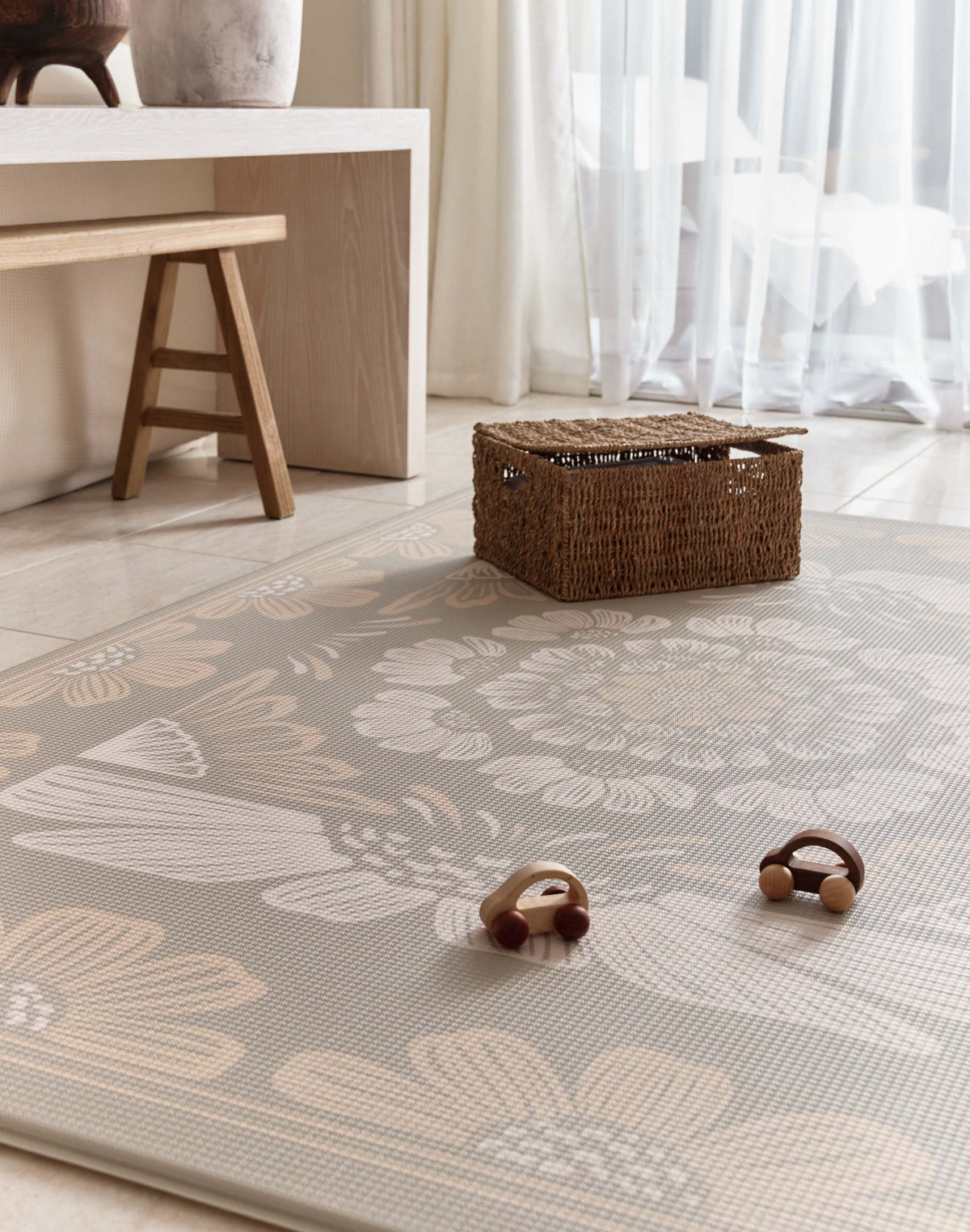 Enhance your home decor with our chic reversible play mat. Designed to look like a beautiful rug, it features a sophisticated boho design on one side and a charming leafy print on the other. This versatile mat seamlessly integrates into your home decor and is made from high-quality TPU foam, ensuring a soft, safe, and easy-to-clean surface for your baby. Perfect for adding a touch of style, whilst providing comfort to play space.