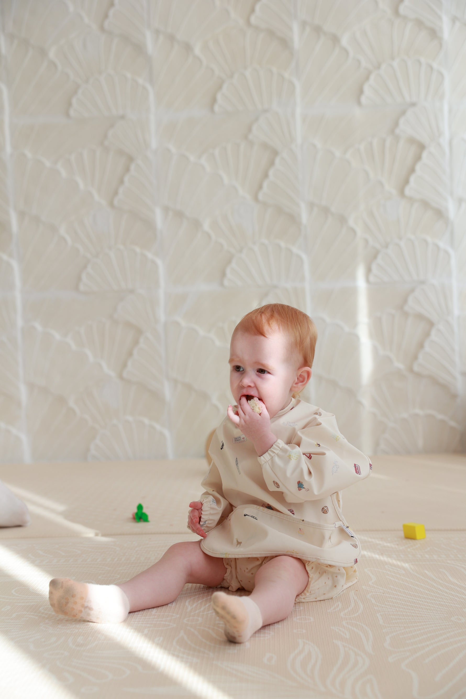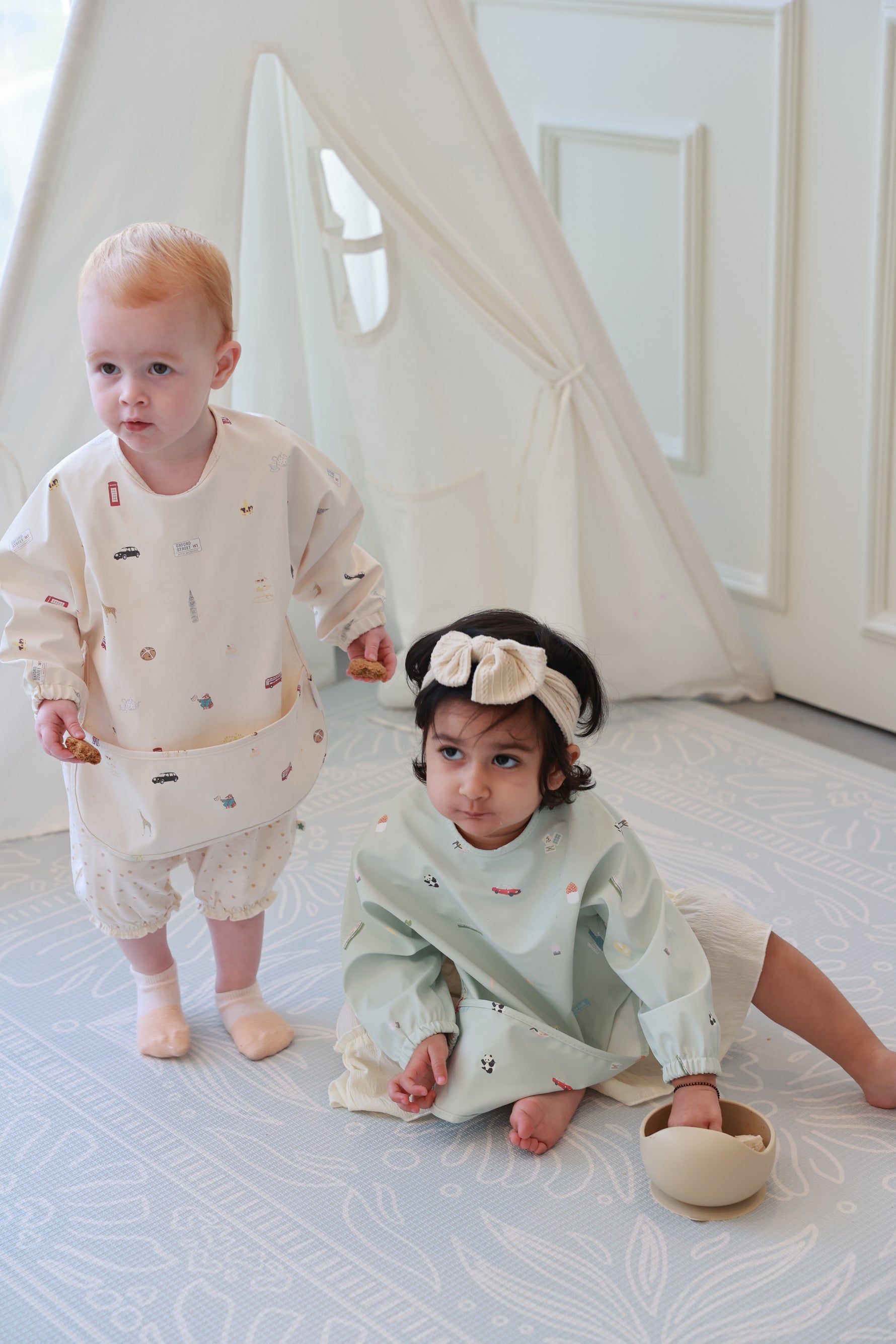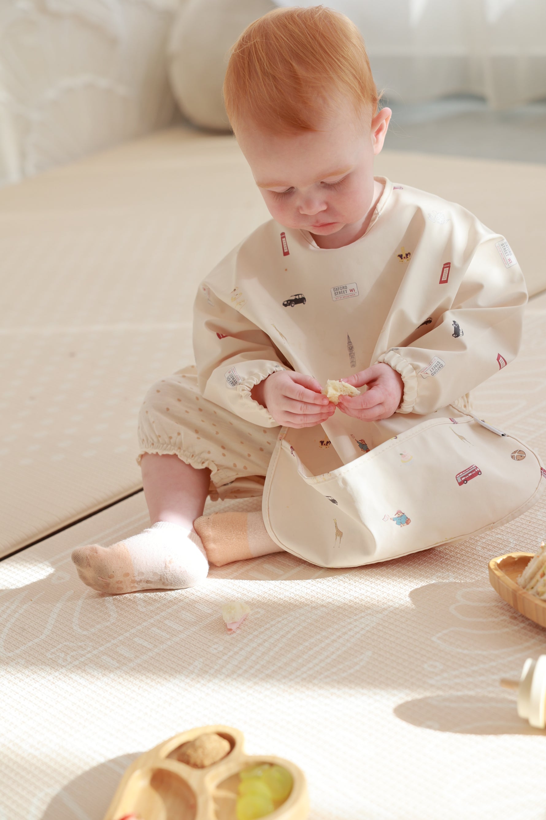 Cheerio, mess! Our London City Printed Bib Sleeve is a playful nod to the charming streets of the UK’s capital. Featuring classic British icons like red double-decker buses, black taxis, Big Ben, crowns, and even Paddington Bear enjoying teatime, this bib brings a whole lot of character to mealtimes. With full-coverage sleeves and a handy catch-all pocket, it's a royally practical way to keep your little one tidy while they explore the taste of adventure.